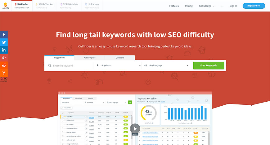 With details such as the number of external links, page authorities, Facebook and Google shares, and estimated visits per month, users can see how they stack up.  When assessing a keyword’s search difficulty, KWFinder summarizes external links, page and domain authority, and social signals to give a score out of 100. Furthermore, KWFinder can capitalize on long-tail keywords to provide hundreds of suggestions—some of which competitors may have missed.
