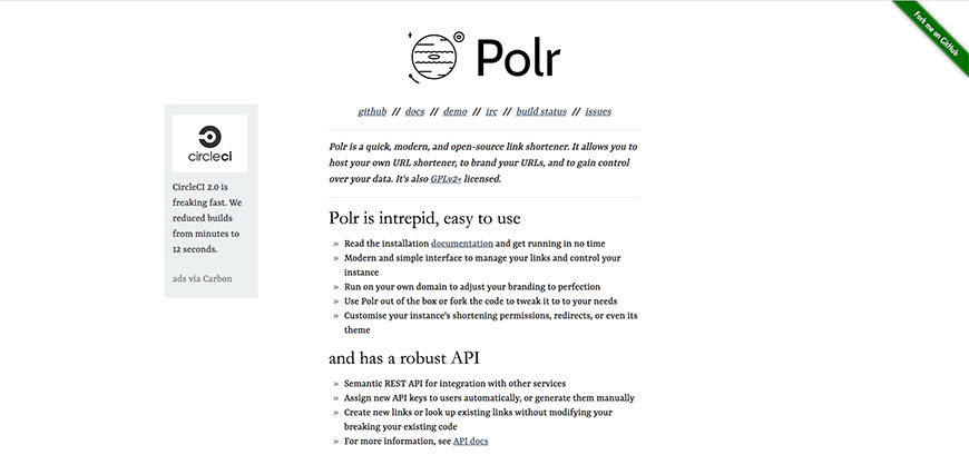 Polr is a URL shortener that is known for its feature of self-hosting, which allows for better branding and therefore better customer trust. It is also a great service to use for shortening links because it has a demo page, which not many other shorteners have. This allows you to try it before you make the commitment. For anyone who is a pro at understanding how URLs and programming works, it can be beneficial for self-hosting.
