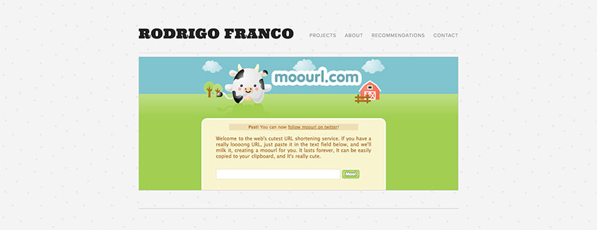 When going to Moourl.com, you are greeted with an adorable cow. Just copy and paste the link you would like to have shortened in the box and click on “Moo!”. Created by Rodrigo Franco, Moourl.com is a URL shortening service that he created as a challenge. Being a software engineer, he has many other projects that have been published to the web. His goal was to create an easy-to-use URL shortener for anyone who needs it.