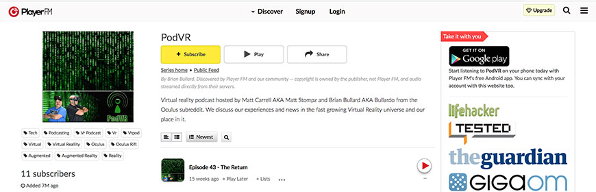 Enter VR’s name is a sort of play on words. On the one hand, it is the name of a collective that is active in the VR community. On the other, it is a call to move to the future which they believe virtual reality gaming and media consumption is. The website offers articles as well as podcasts, which date back to 2013. But the podcasts have guest speakers who can explain more of the VR concepts with more clarity. Though they prioritize gaming as one of the more important aspects of the VR movement, Enter VR’s podcasts also address VR use outside of gaming. Some podcasts relate to VR use in the medical field for scanning while others touch on the combination of VR and spiritualism. There is also the possibility of attending meetups that allow for the podcast audience to join together and discuss the topics presented and also the future of VR. This is a great way to get further information from the podcast topic as well as meeting like-minded people, though the area is limited to those on the west coast. The podcasts themselves are very organized and new content is posted regularly. There are also typed notes that accompany each podcast that serves as a preview of what was discussed.