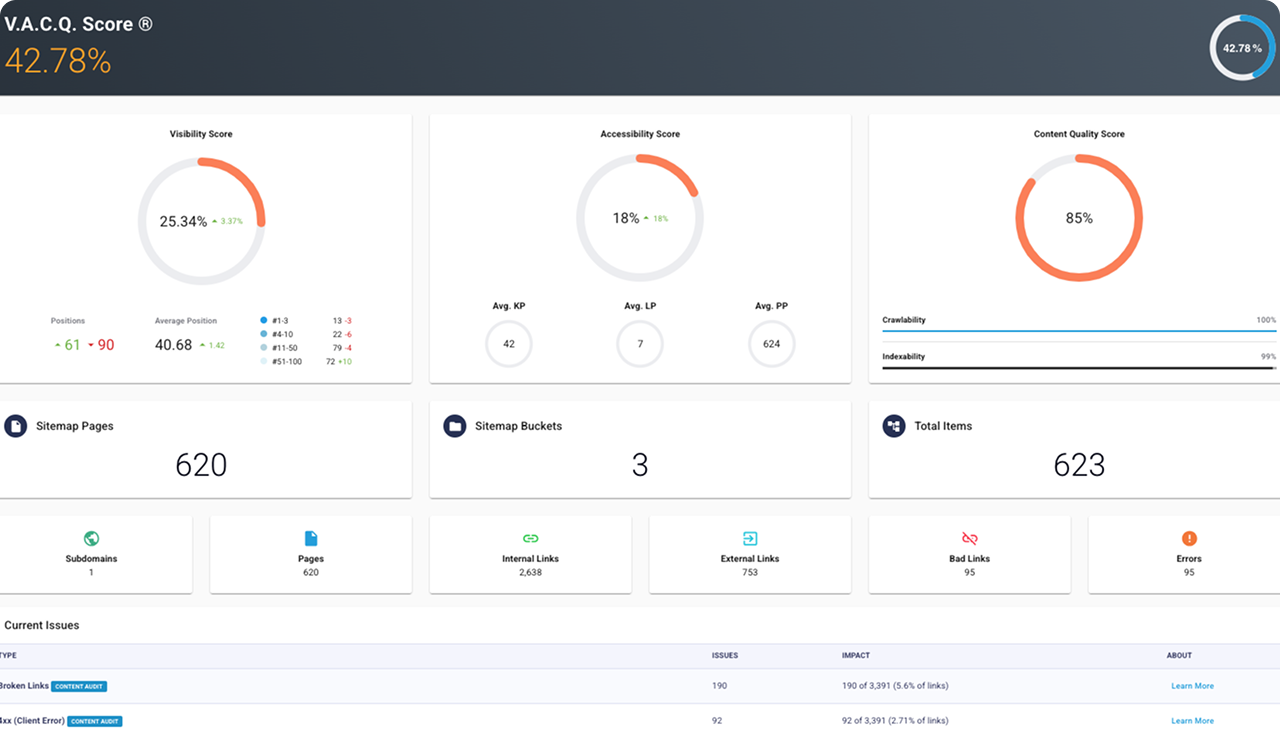 Visibility Accessibility Content Quality Score® measures the overall health and quality of a website, document, or application’s online presence.